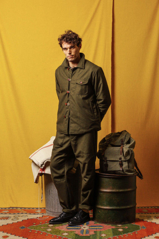 Die Hebron 796 Olive Washed Wool Flannel Reversible Naval Shirt Jacket von East Harbour Surplus ist von den Hemden und Jacken inspiriert, die vom Marinepersonal während des Zweiten Weltkriegs getragen wurden, und verfügt über eine weiterentwickelte Passform und hochwertige Materialien. Dieses Kleidungsstück verfügt über zwei Jacken in einer, mit einem mittelschweren, gewaschenen Wollflanell-Webstuhl ähnlich einem Melton, der Farbe passt zu einem Box Quilted Satin-Polyester für zwei unterschiedliche Ästhetiken in einem bequemen und utilitaristischen Stück, das modernen Vintage-Appeal und Schutz vor schlechtem Wetter bietet. Diese Hemdjacke ist für diejenigen geeignet, die von klassischer Herrenmode inspiriert sind und nach einem authentisch produzierten Stück suchen, das aus zeitlosen und getesteten Militaria mit einer modernen Passform entwickelt wurde. Eines der neuen klassischen Stücke von East Harbour Surplus, mit Materialien und Designs, die an die Originale erinnern, umfasst einen Rollknopf- und Hanfschlaufenverschluss, einen spitzen Camp-Kragen, eine geknöpfte, aufgesetzte Brusttasche auf der Wollseite und umlaufene Handtaschen innen und außen, plissierte Knopfbündchen und kastanienbraune natürliche Corozo-Knöpfe. Die Hebron-Jacke repräsentiert die Werkstattproduktion in Italien und ist auf beiden Seiten sauber mit gerollten Nähten und Einzel- und Doppelnadelkonstruktion gefertigt. Die Hebron Reversible Olive Washed Wool Naval Shirt Jacket wird zu einem stilvollen Klassiker werden, der historischen Einflüssen huldigt und gleichzeitig in der zeitgenössischen Herrenmode relevant bleibt.